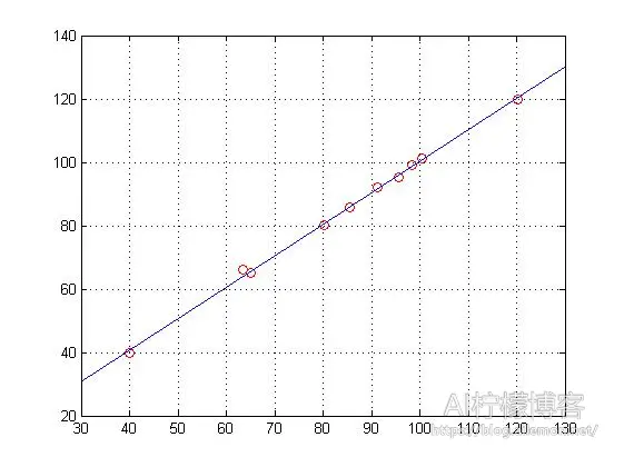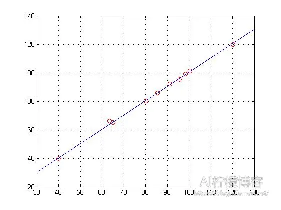 将面积值存到变量 X 中,总价则存到变量 Y 中,然后做线性回归。在 MATLAB 中,我们可以直接使用 polyfit()和 regress()函数来实现。得到的图像如下图,我们可以看到,数据样本点均匀分布在直线的两侧。