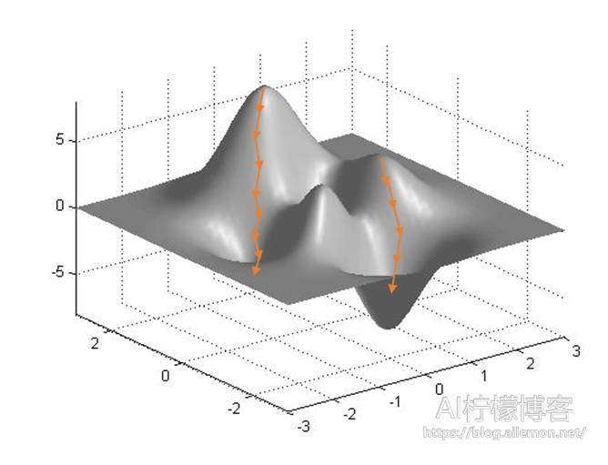 从其中一点出发,沿着梯度的相反方向走一小步,然后在所到的位置处,再沿着梯度的相反方向走一小步,如此下去,直到走到“山谷”为止,即收敛。不过,使用梯度下降的时候,有时候并不能收敛到全局最小值,而是陷入到了局部的极小值,如上图所示。由图可以看出,从不同的两点,经过梯度下降,收敛到了不同的极小值点。为了解决这一个问题,我们可以随机地从不同的几个点分别开始梯度下降,可能会收敛到不同的极小值点,这时,我们选取其中值最小的一点作为结果即可。虽然这样也并不能保证一定收敛到全局最优点,但是概率已经是很大的了。